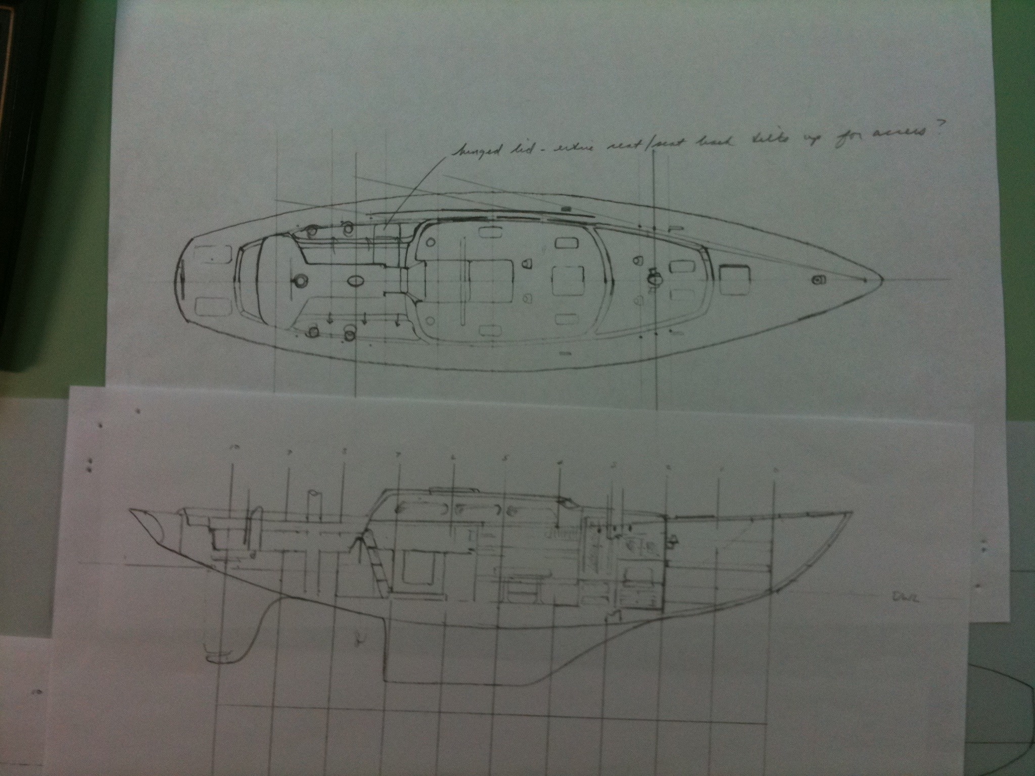 Then I began thinking about my Westlawn studies and how the school made us do drawings by hand before we could use CAD. Drawing by hand is an enormously time consuming task. Drawing a set of lines and making them ‘fair’ could easily consume a few hundred hours. Here’s an example of preliminary drawings of a deckplan and accommodation plan for a 42′ ketch I was designing. It doesn’t look like much but there’s a hundred or so hours in these two drawings